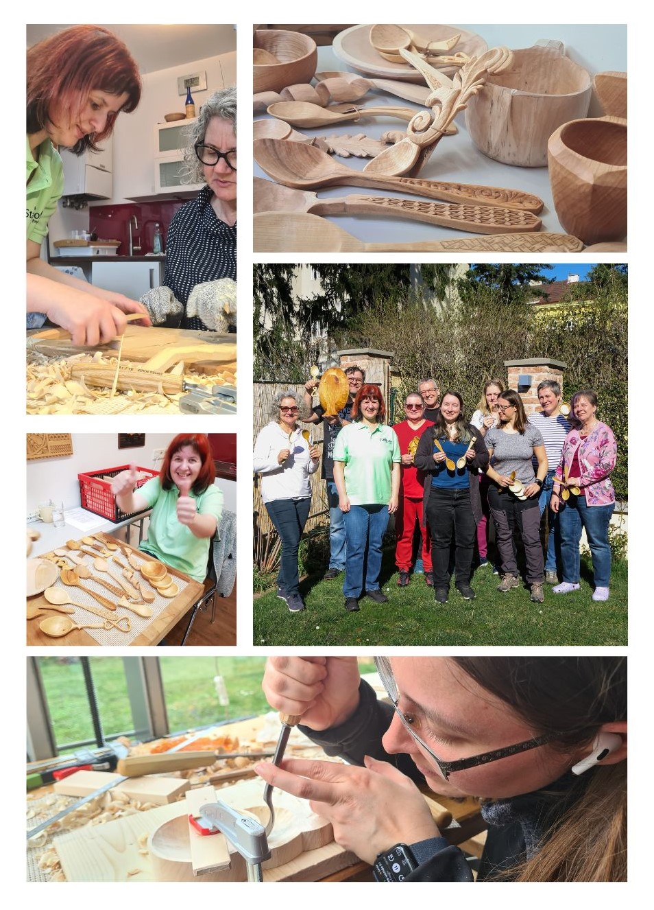 Die TeilnehmerInnen tauchten ein in die Vielfalt der Löffel- und Schalen-(Guksi-)gestaltung. Dabei lernten sie nicht nur etwas über die Geschichte und Bedeutung, sondern verwendeten auch neue Werkzeuge und andere Arbeitstechniken als wir es bisher aus dem Kerb-, Flach- und Reliefschnitt kennen.