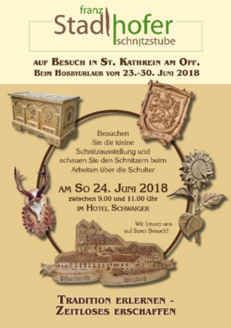 Damit auch andere Interessierte die Möglichkeit erhalten, den knapp 30 Schnitzern beim Arbeiten über die Schulter zu schauen, laden wir am Sonntag, 24. Juni 2018 zwischen 09.00 und 11.00 Uhr ins Landhotel Schwaiger ein.